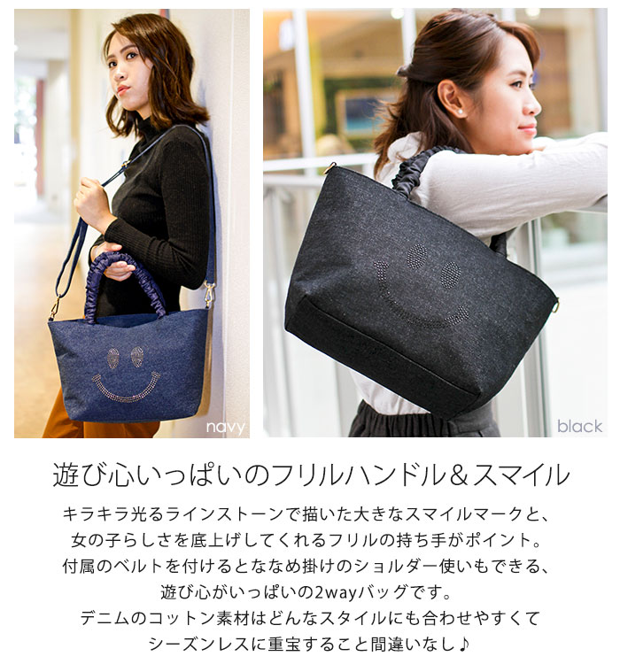 (ラムモード)LAMB MODE スマイリー トート ショルダー バッグ 2way レディース ラインストーン フリルハンドル 普段使い スマイル デイリー 軽量 好印象 オシャレ コンパクト カジュアル 送料無料 36621 母の日 ギフト 花以外 実用的 2019 早割