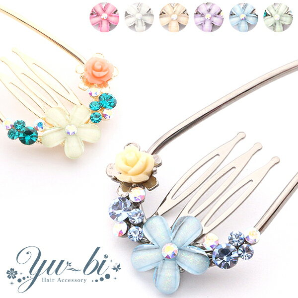 【メール便140円】特許取得!薔薇&クリアお花 夜会巻きコーム/ヘアコーム/コーム/モアコームボーテ 2本足 ラインストーン mcbe40 ピンク/白/紫/水色/緑 髪飾り バラ ヘアアクセサリー お団子 アレンジ髪 結婚式【あす楽対象】
